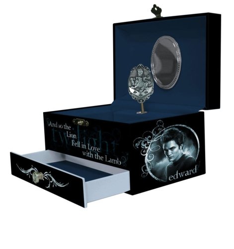 This Official Twilight Movie jewelry box has a glossy black finish with dark blue velvet like lining. The Cullen crest spins in front of the mirror while the box plays the classical song "Claire de Lune". This song is heard throughout the movie and when Bella and Edward started to dance. The top of the box has a picture of Edward and Bella with the Twilight logo. One side has Edward's picture and